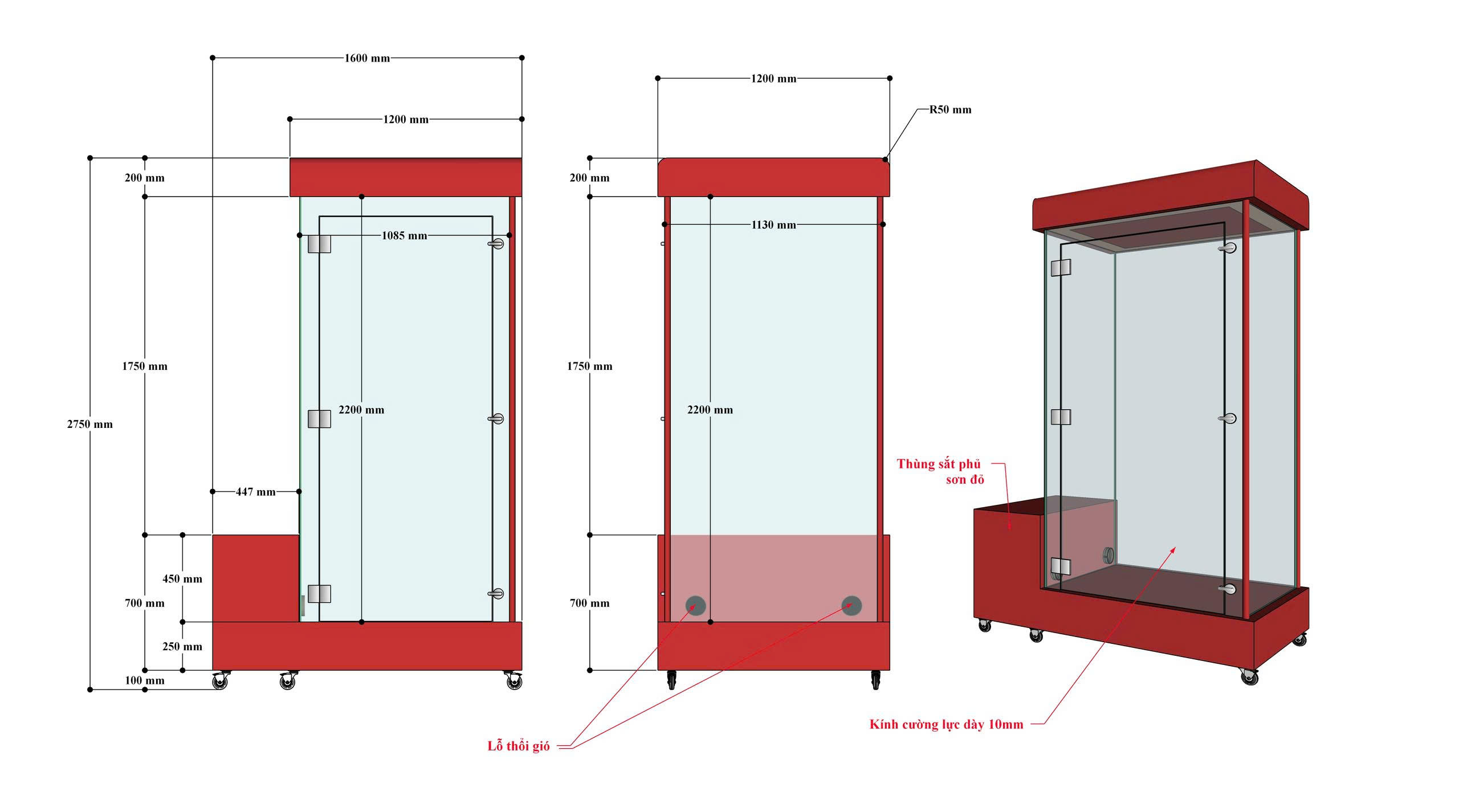 - Thiết kế cao cấp: Thùng sắt phủ sơn đỏ nổi bật, khung kính cường lực dày 10mm đảm bảo an toàn và quan sát 360 độ.